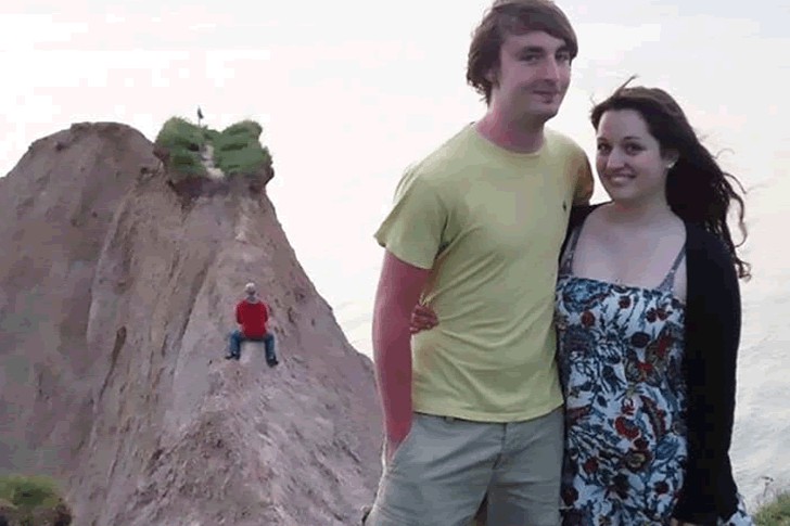 In this case, this couple seemed to be on vacation and were spending their getaway at a relatively hilly location. They're actually supposed to be the subject of the photo, but take a quick look at the man in the background. What could he be doing there? Number two? Well, we never know, but we can assume that the man in the picture popped the question considering how he's concealing his hand inside his pocket.
